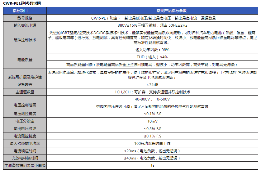 CWR-PE系列能量回饋式動力電池性能檢測系統是一款由計算機遠程檢測監控處理平臺控制的雙向單通道、多通道高精度直流電源處理系統,用戶可以設定參數對設備與負載之間能量的雙向流動靈活的進行控制。該系統專為滿足用戶對動力電池PACK進行性能檢測的需求而設計,同樣也適用于對各種直流負載(不僅包括電池)進行性能測試