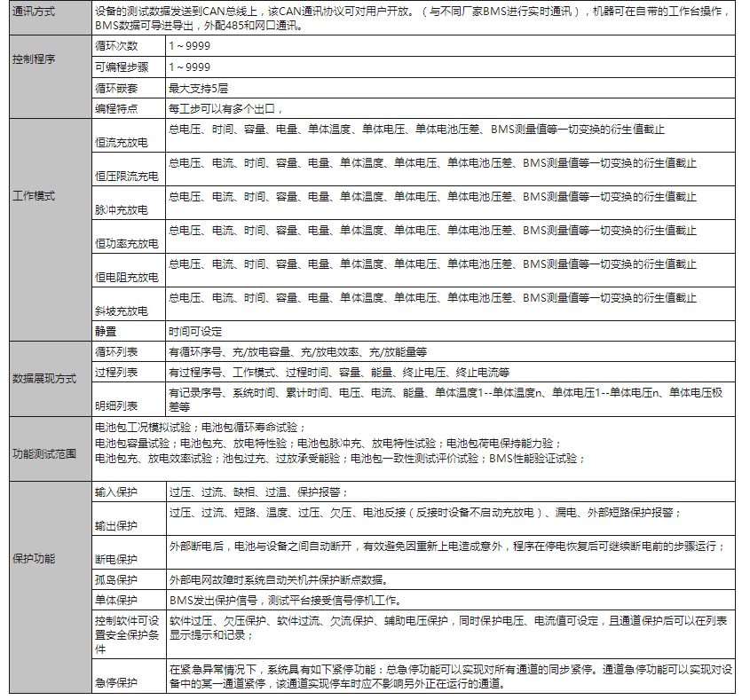 • 支持CANCAN2.0B, RS-485,以太網通訊、BMS通訊進行實時數據對接。操作可通過機器自帶工作臺操作,無需另外配套電腦。能直觀顯示并記錄充、放電測試設備的各種實時數據、工況轉換、故障信息等;具有強大的數據查詢、分析、管理功能;可儲存并查看歷史數據,并自動繪制歷史數據曲線,可導出、打印數據分析報表(EXCEL)和測試報告(PDF)。