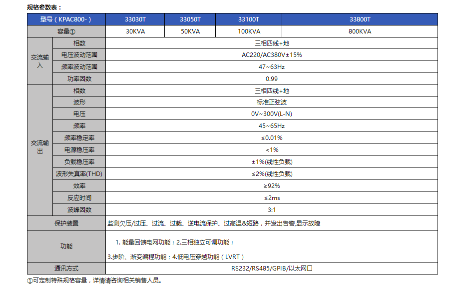 KPAC800系列具備能量回饋功能,可將能量回饋至電網,節省能源及降低整體的購置成本。內建的低電壓穿越功能(LVRT),用戶可以輕松模擬各法規的相關電壓跌落曲線,通過步階、漸變的編程功能可設定連續或階段式的電壓及頻率變動。三相獨立可調功能可獨立調整各相的電壓,適用于多臺單相負載相位可調功能,可設定三相之間相位角度。