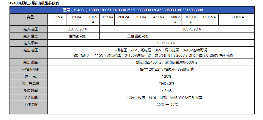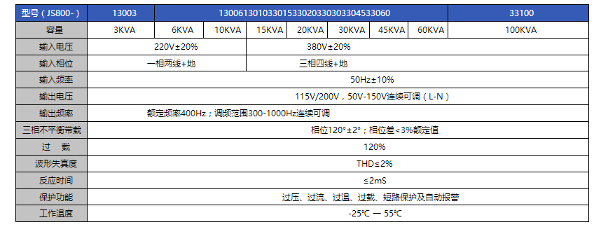 描述: JS400系列400Hz中頻電源專門為航空、電氣設備研發制造,可廣泛應用于飛機啟動、維修供電、組裝基地、及機載設備、雷達等電子設備實驗室等場所,為其提供穩定的400Hz交流電。