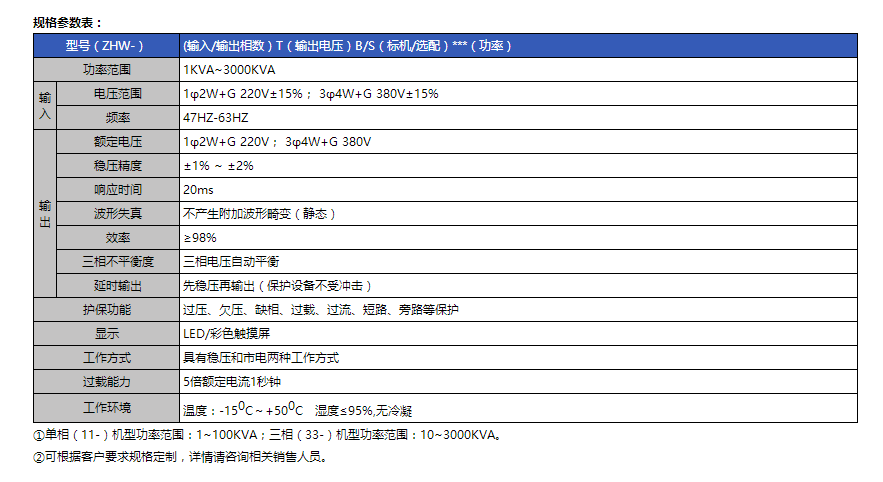 描述: ZHW系列無觸點感應式交流穩壓電源是一款采用DSP控制電磁開關矩陣的泛用型、高性能穩壓電源。本系列穩壓電源通過改變補償變壓器主回路與補償回路電磁耦合的大小,控制穩壓電源輸出端的電壓,其具備優異的過載能力,適配于沖擊性強、且頻繁的感性負載,能承受啟動時瞬間5倍大電流,該功率范圍涵蓋1~3000KVA。